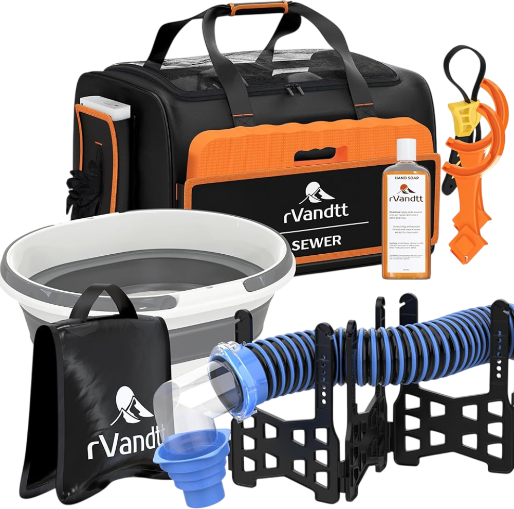 This RV Sewer Accessories Kit is the kit every RV’er needs. This kit has 15ft sewer hose w/4in 1 Adapter, stand, collapsible bucket, nitrile gloves, hand cleaner, wrenches, kneeling pad that my husband definitely needs, hose weight and a custom bag that holds and has a place for all of it. I could not have imagined a bag with all these essentials. You can’t have enough of these items. We have gone through a few hoses and this kit is ready to go for use. The flexibility of the hoses and the functionality is definitely worth it. It’s worth it. The hoses and the tools seems very durable.