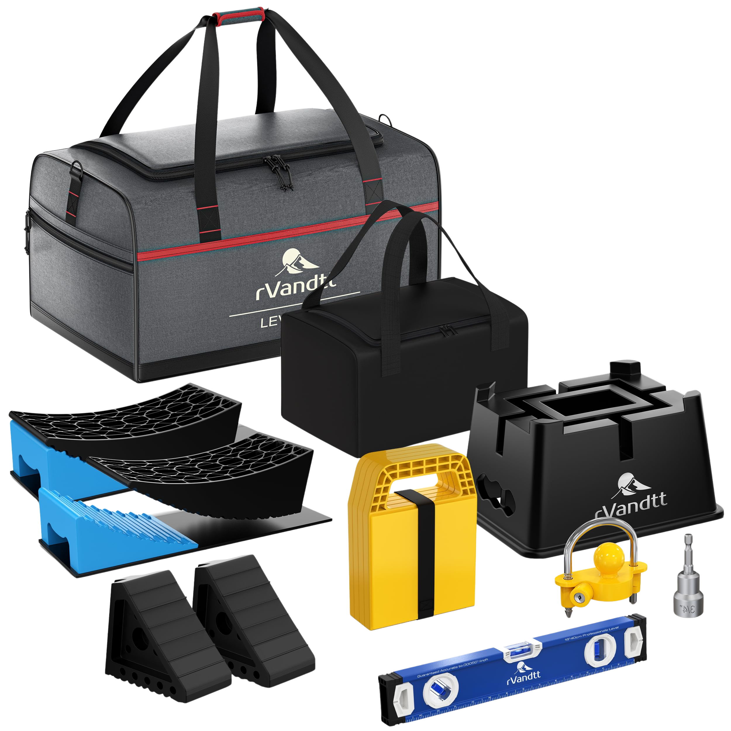 This rVandtt Travel Trailer/Toy Hauler Leveling, Stability, and Security Kit is awesome! It comes with two very heavy duty wheel chocks, which is great for my large toyhauler. The plastic yellow ones tend to get squished after a while, these are not going to get squished at all. They are very similar to the wheel chocks my dad had for his semi truck, super heavy duty, very nice. It also included a couple wheel leveling ramps, these are the rocker style ramps that you can adjust for more or less height. They work really well and have a lot of adjustability. It comes with a very nice hitch lock as well and a very chunky landing gear pad that will really help with stability there. The carrying case is super nice as well. Overall this kit is great and has just about everything you'd need to get your rv level and keep it in place. Very happy!